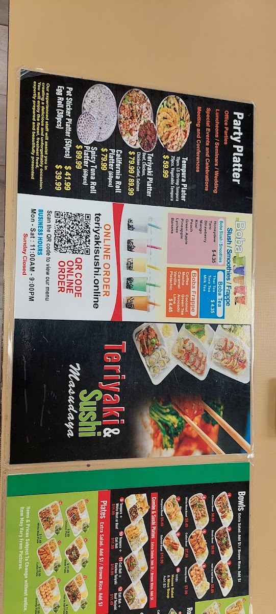 With its wide range of flavorful options, Teriyaki Masudaya is sure to have something for everyone, whether you're in the mood for a light sushi roll or a hearty teriyaki plate.