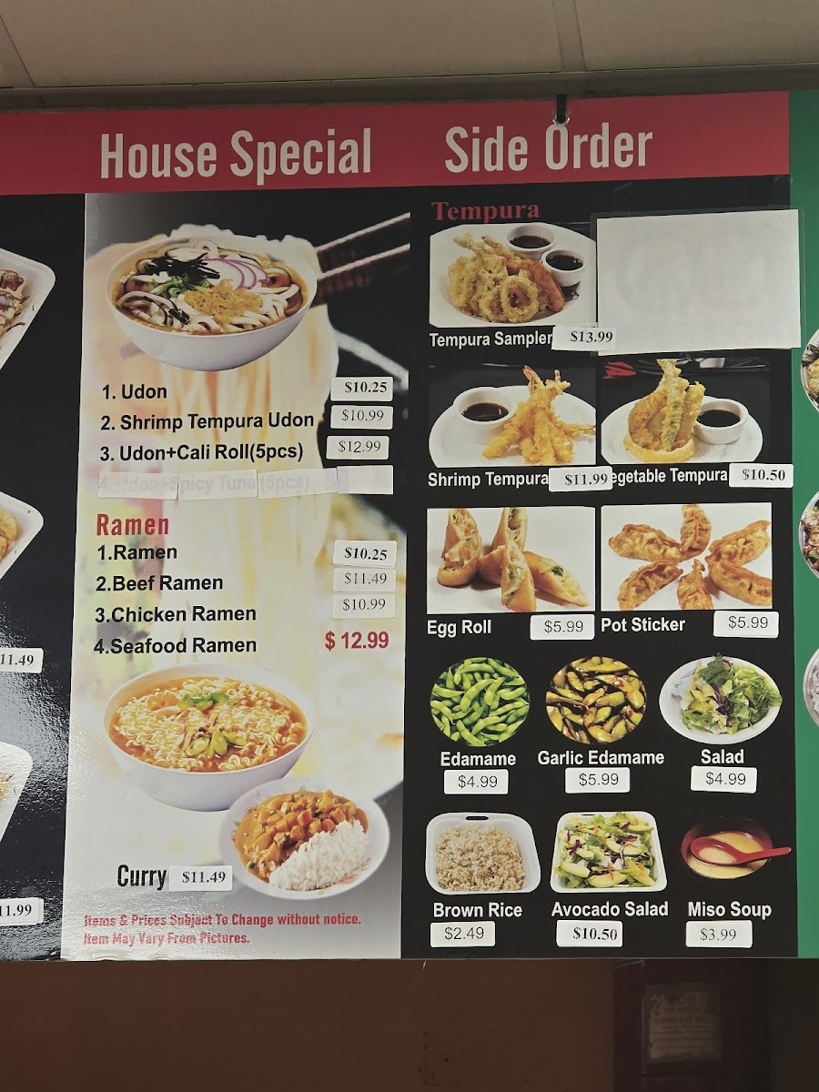 Lastly, the noodles section features comforting dishes like Udon + Spicy Tuna (5 Pieces), Shrimp Tempura Udon, and Udon + Cali Roll (5 Pieces). The Ramen is a must-try for noodle lovers, providing a delicious and filling option.