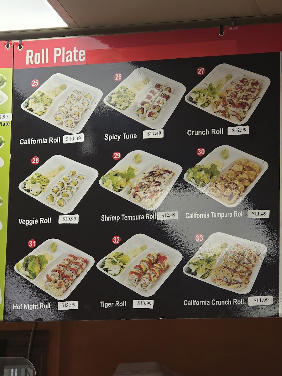For sushi lovers, the rolls menu offers a variety of options such as the fresh Avocado Roll, the crispy Tempura Cali Roll for $30, and the flavorful Shrimp Tempura Roll for $29. There's also the Tiger Roll for $32, a bold choice for those looking to indulge in something special, as well as the simple and satisfying Veggie Roll for $28.