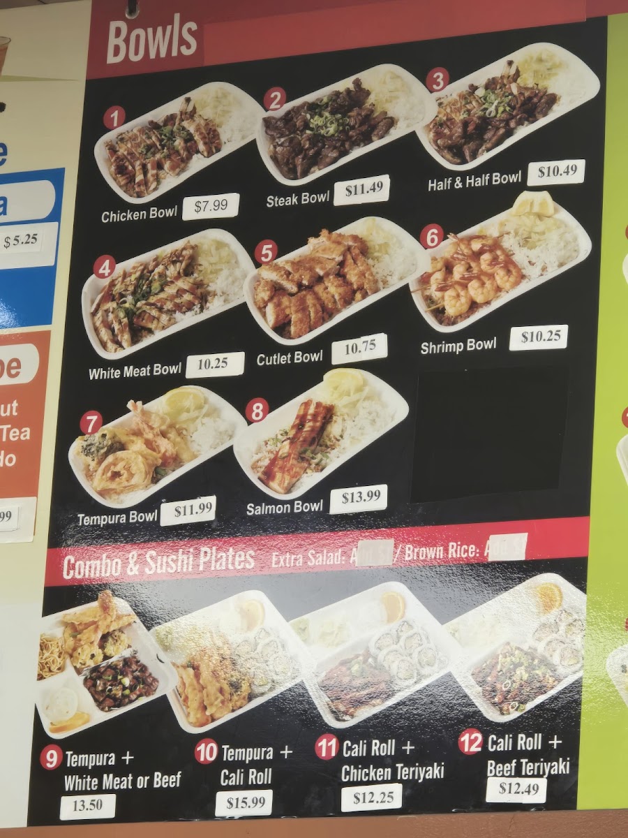 The teriyaki bowls are a highlight, with options like the Steak Bowl for $2, the Half & Half Bowl for $3, and the Tempura Bowl for $7. The Cutlet Bowl is a great option for those who love crispy fried goodness, priced at $5, while the Chicken Bowl is available for $1.