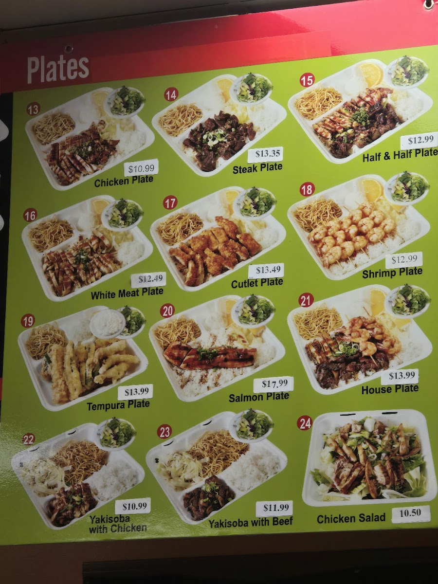 For a more substantial meal, the teriyaki plates provide hearty portions such as the Cutlet Plate for $17, the Steak Plate for $14, and the delicious Yakisoba With Beef for $23. The Chicken Salad Plate for $24 and Tempura Plate for $19 are also solid choices for a complete, satisfying meal.